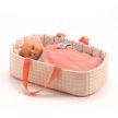 Könnyű és praktikus mózeskosár rugalmas fogantyúkkal, hogy a gyermek a babáját bárhová magával vihesse. Igazi hangulatos fészek a puha takarójával és párnájával, hogy a játékbaba kényelmesen, melegen aludjon. 30-36 cm-es játékbabáknak alkalmas. Steppelt pamutból készült, könnyű. A mózeskosárban lévő takaró és párna a készlet részei.