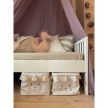 Tarts rendet a gyerekszobában ezzel a stílusos és praktikus textilből készült tárolókosárral. A tárolókosár az előszobában is jól használható a gyerekek sálainak, sapkáinak és kesztyűinek tárolására. A gyerekszoba szép berendezési tárgyává is válhat, és kényelmesen párosítható szövetből készült kosárkáinkkal, hogy teljes legyen az összhang. Ez a termék részben újrahasznosított anyagból készül, ezért a textíliák színe kissé eltérhet. A kosár egyik oldalán egy aranyos mackó arca látható. A tárolókosár körös-körül rojtokkal van díszítve.